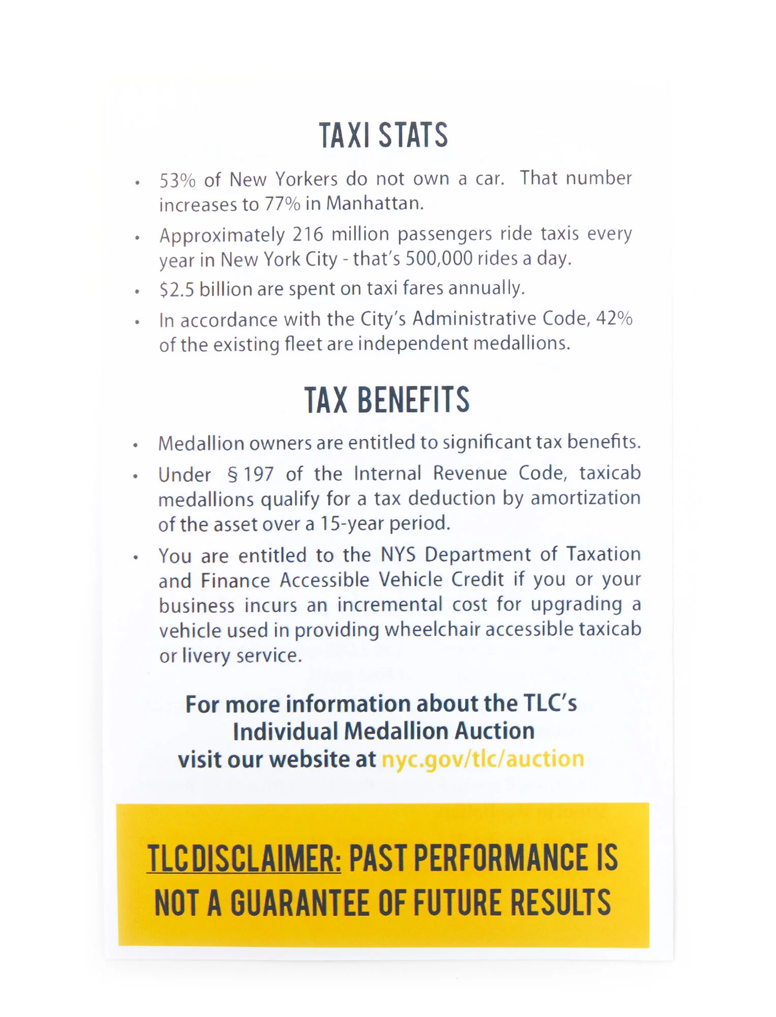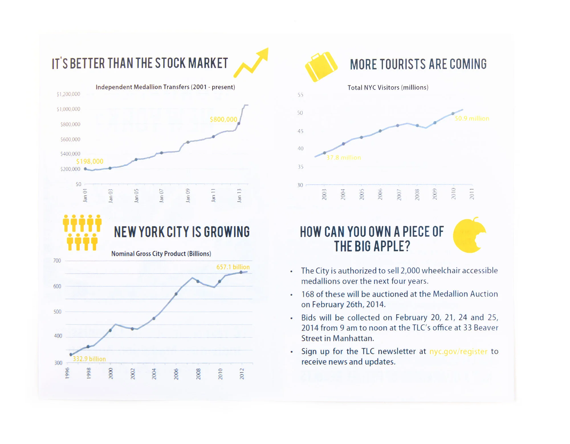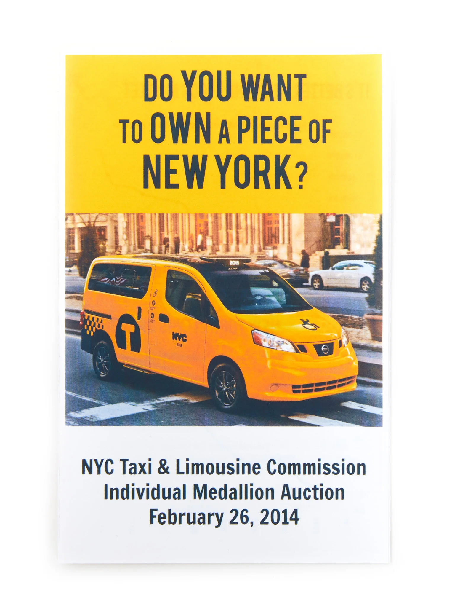 This is a pamphlet created by the Taxi and Limousine Commission in February 2014, a few months prior to the crash. The pamphlet promotes a medallion auction, during which the city sold 150 medallions at the peak of their value.